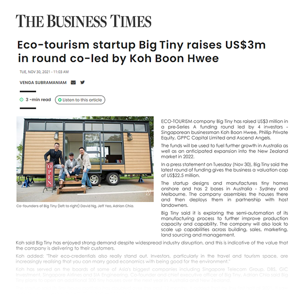 Big Tiny is the 1st Singapore-based company to integrate the concept of Eco-tourism. We help owners of tiny houses manage and rent them out online through our Big Tiny Hospitality platform - tinyaway.com and other major platforms like Airbnb.